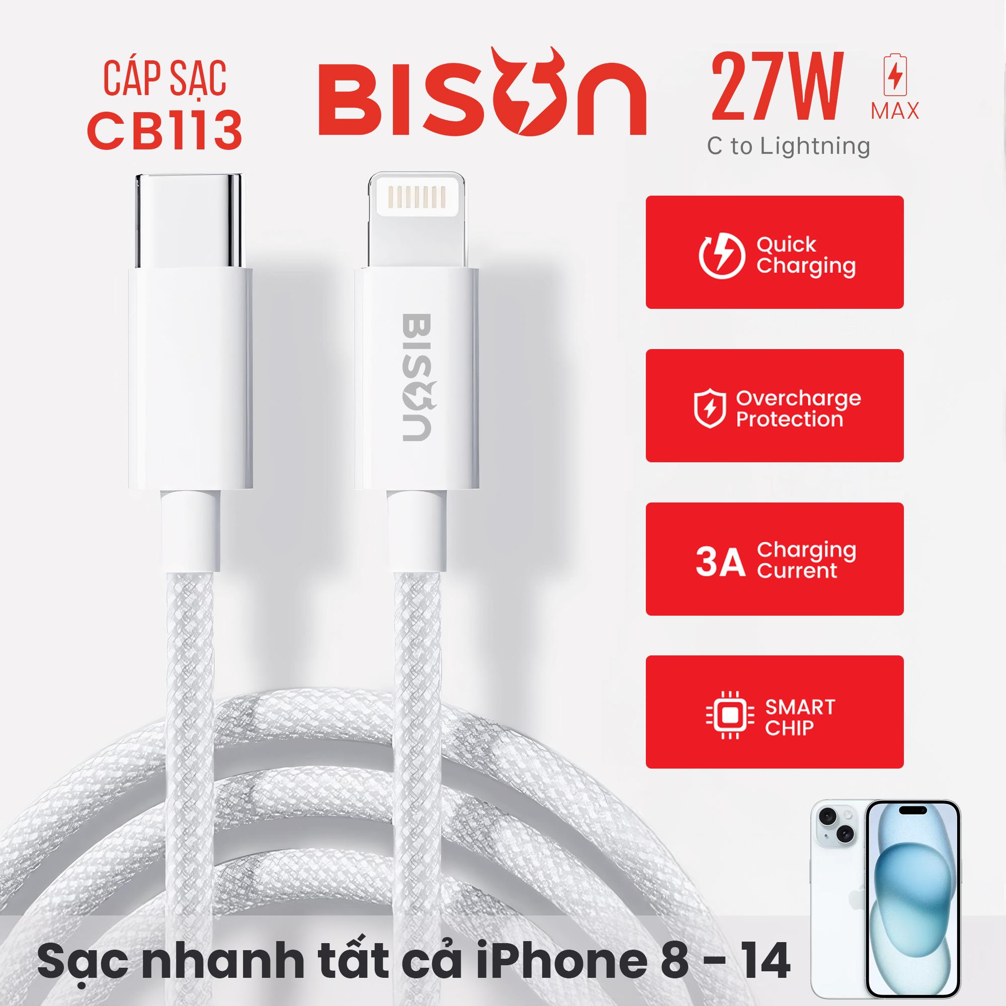Cáp sạc Bison bọc dù 27W, USB-C to Lightning (C to L), CB113
