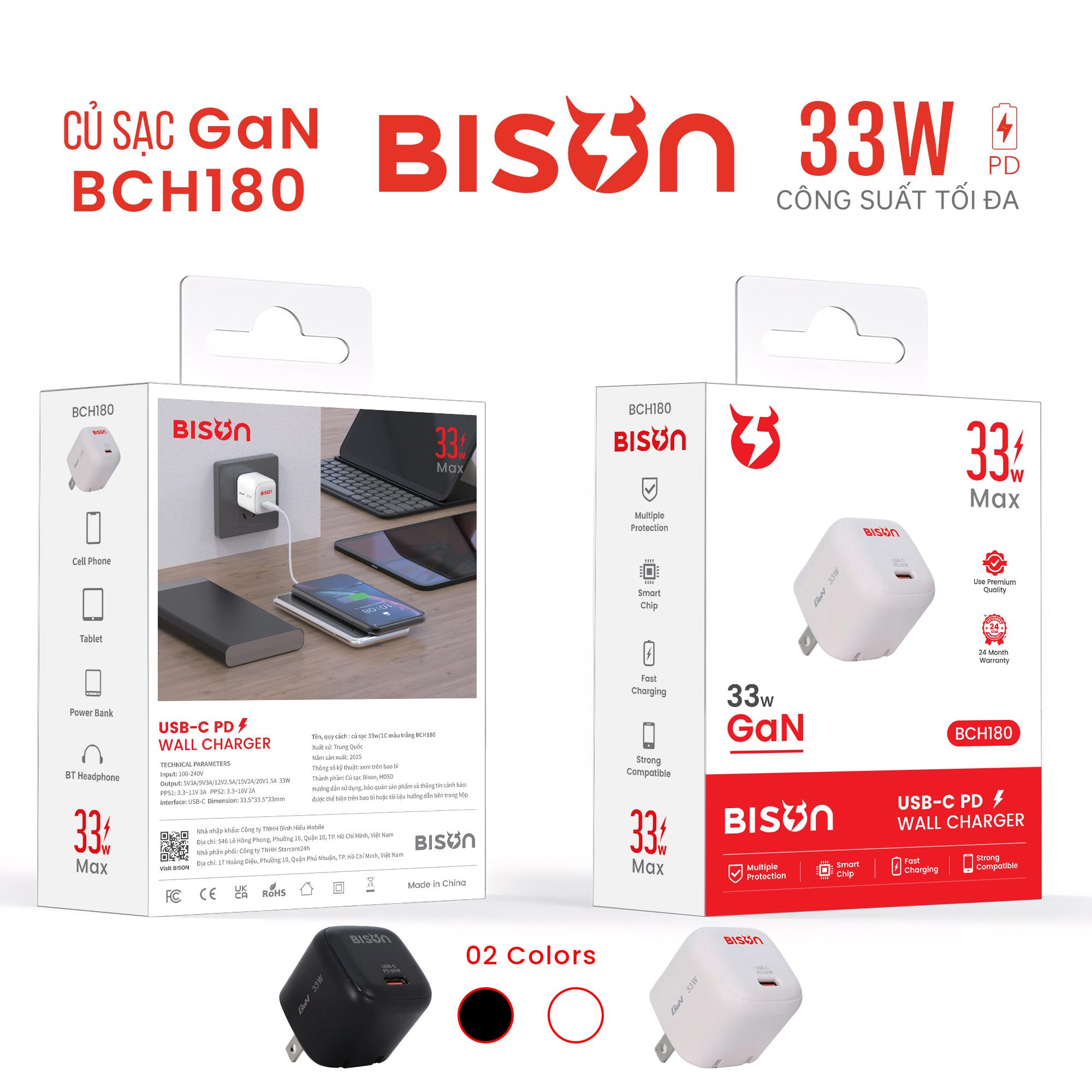 Củ sạc nhanh BISON BCH180 30W GaN USB-C PD chuẩn us Model: BCH180 Thông tin chi tiết sản phẩm: Công suất: 30W Max Công nghệ: GaN (Gallium Nitride) – Cho phép kích thước nhỏ gọn hơn và hiệu suất cao hơn so với các bộ sạc truyền thống. Cổng sạc: USB-C PD (Power Delivery) – Hỗ trợ sạc nhanh cho các thiết bị tương thích. Tính năng an toàn: Bảo vệ đa lớp (Multiple Protection) Tương thích: Điện thoại di động, máy tính bảng, pin sạc dự phòng, tai nghe Bluetooth và các thiết bị khác có hỗ trợ sạc qua cổng USB-C. Chứng nhận: CE, RoHS Xuất xứ: Sản xuất tại Trung Quốc