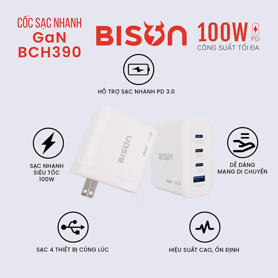 Củ sạc nhanh BISON BCH390 4 cổng sạc (1A+3C) 100W chuẩn us Thông tin chi tiết sản phẩm: Công suất: 100W Max (tối đa) Cổng sạc: 1 cổng USB-A 3 cổng USB-C Công nghệ: – GaN (Gallium Nitride) giúp sạc nhanh hơn, nhỏ gọn hơn và hiệu quả hơn. – Smart Chip: Tự động nhận diện và điều chỉnh dòng điện phù hợp cho từng thiết bị. Tương thích: Đa dạng thiết bị, từ điện thoại, máy tính bảng, pin dự phòng đến laptop. Tính năng an toàn: Bảo vệ đa lớp, chống quá dòng, quá áp, quá nhiệt, ngắn mạch. Chất liệu: Vỏ nhựa cao cấp, bền bỉ. Chứng nhận: FCC, CE, CB, RoHS. Bảo hành: 24 tháng. Mô tả ngắn: Bộ sạc tường BISON 100W với 4 cổng sạc (1 USB-A và 3 USB-C) và công suất lên đến 100W, cho phép sạc nhanh nhiều thiết bị cùng lúc. Công nghệ GaN tiên tiến giúp bộ sạc nhỏ gọn nhưng vẫn đảm bảo hiệu suất cao. Tích hợp Smart Chip bảo vệ thiết bị khỏi các sự cố về điện.
